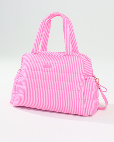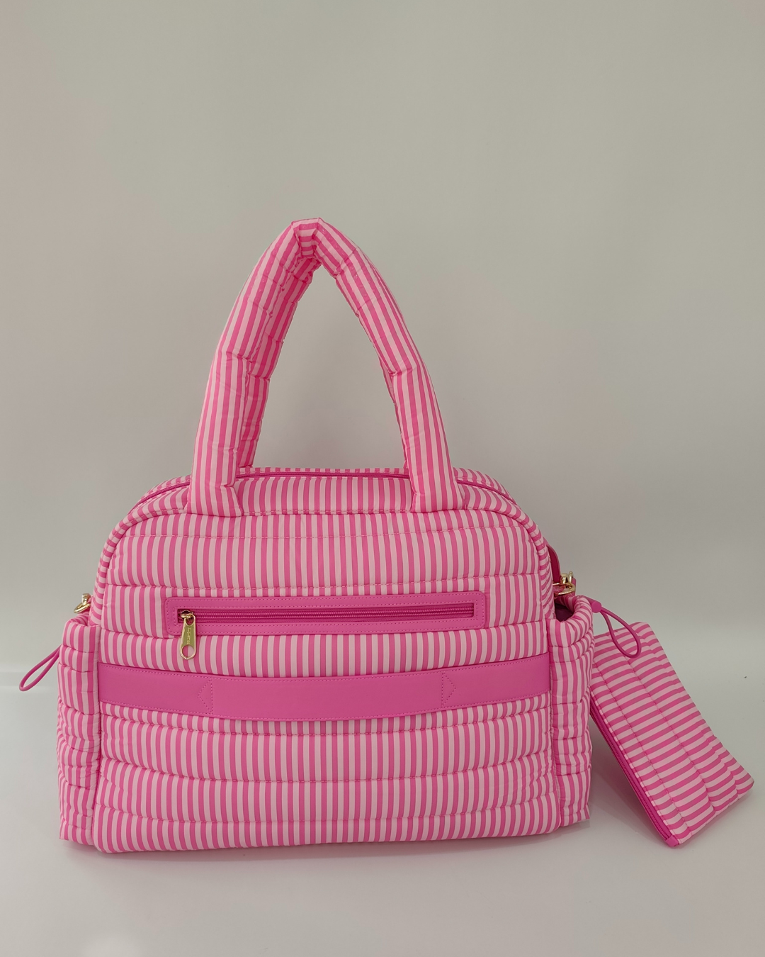 lightweight, water-resistant, and designed to keep you organized on the go, the bubblegum strip weekender is made for last-minute trips, long weekends, studio days, and everything in between. the soft bubblegum tone paired with an athletic-inspired strip detail gives it a standout look without sacrificing everyday practicality.